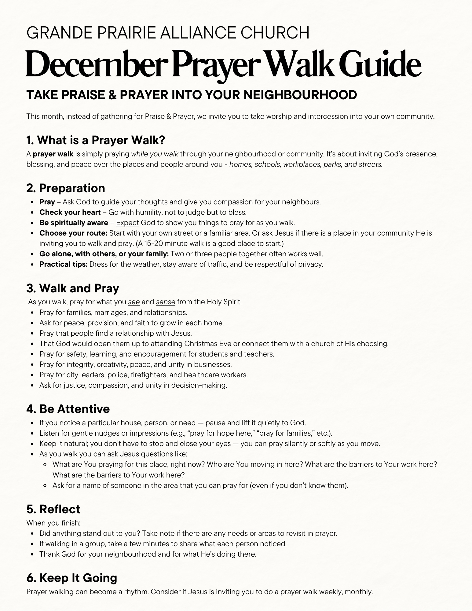A prayer walk is simply praying while you walk through your neighbourhood or community. It’s about inviting God’s presence, blessing, and peace over the places and people around you - homes, schools, workplaces, parks, and streets.